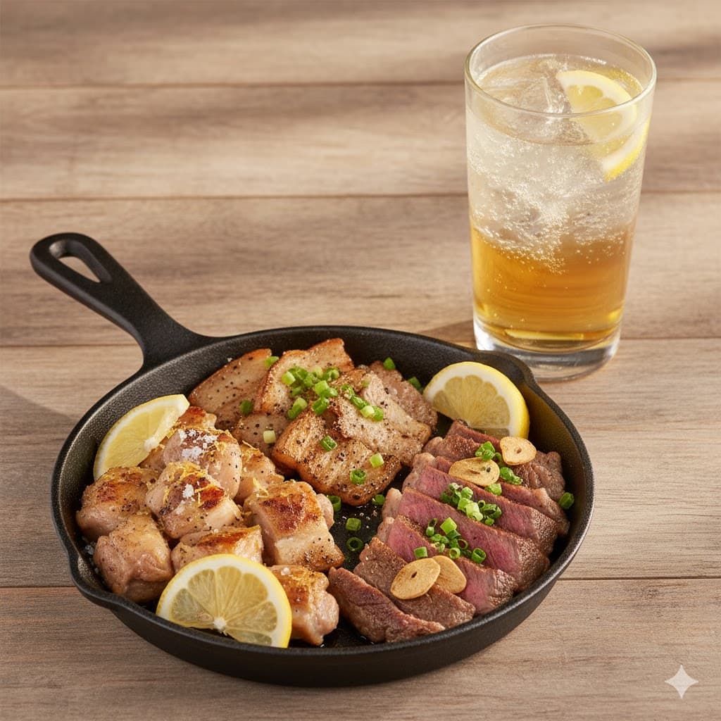 - 牛ハラミにんにくレモン:強めの火で面を焼き、火を止めて刻みにんにく+レモン+塩で余熱和えにすると香りが立つ。