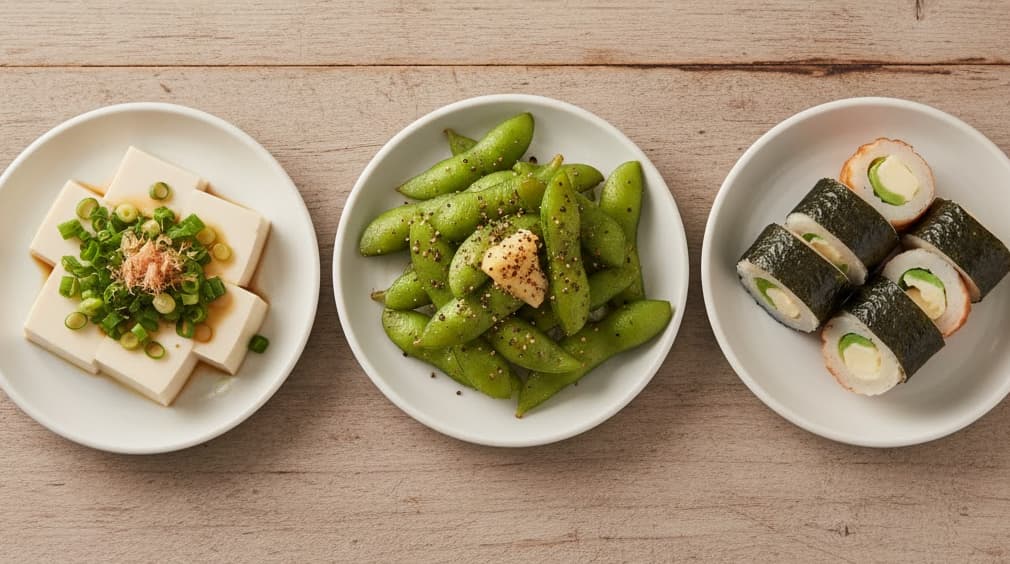 - 冷やし豆腐の香味のせ:絹豆腐に刻みねぎ+おろし生姜+醤油数滴で最短1分。