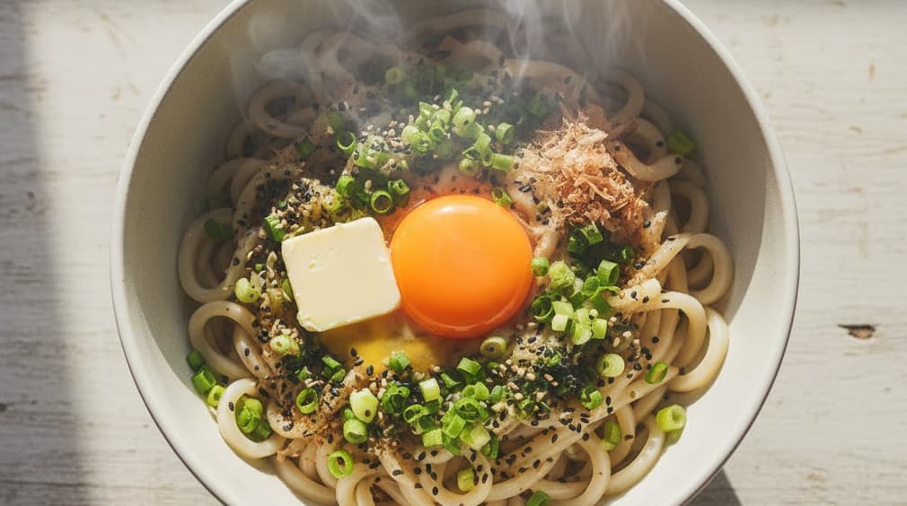 - 釜玉バターうどん:冷凍うどん+卵黄+バター+めんつゆでとろける旨さ。
