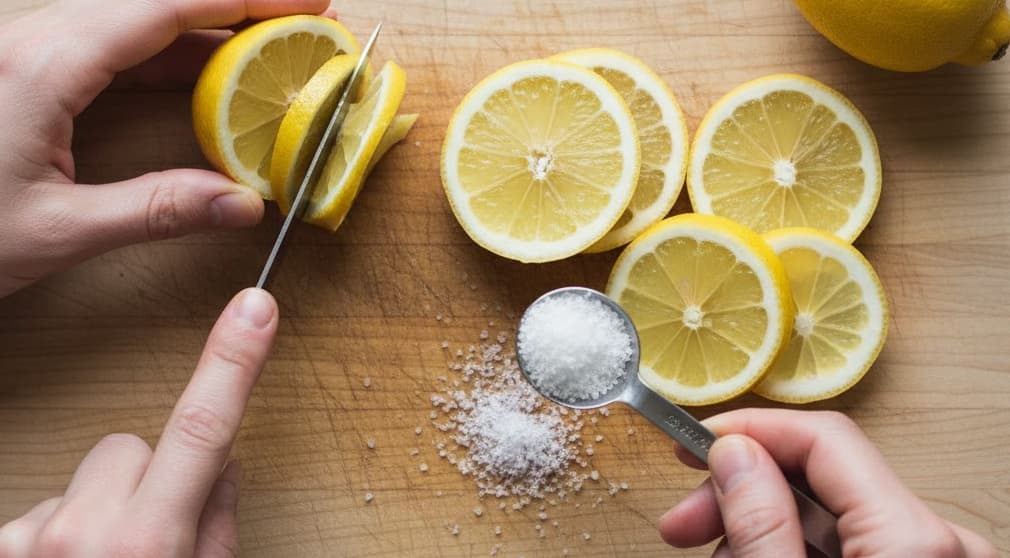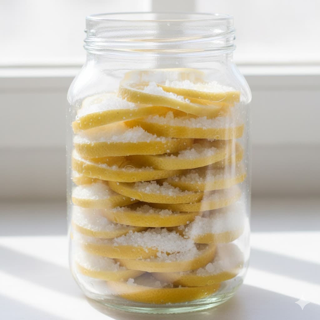 - 熟成2〜4週:レモンをくし切りにし、清潔な瓶に塩(重量の10%)と交互に詰める。半日常温→冷蔵、1日1回瓶を上下し、1週目から使用可。2〜4週で香りが丸くなる。